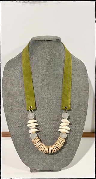 Suede Strap Necklace Bone Glass Beads Coconut Wood- Green
