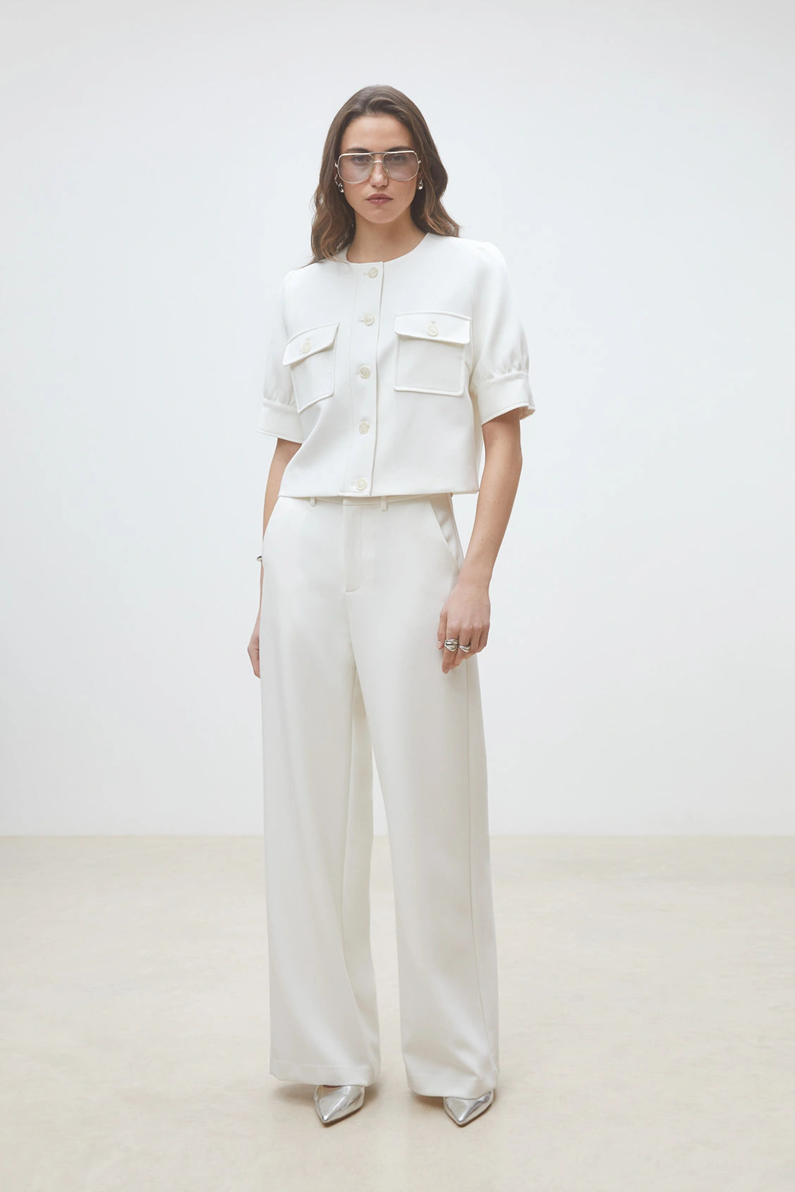 - Wide-leg flowing trousers - Zip and hook fastening under a placket - Two side pockets - Wide legs