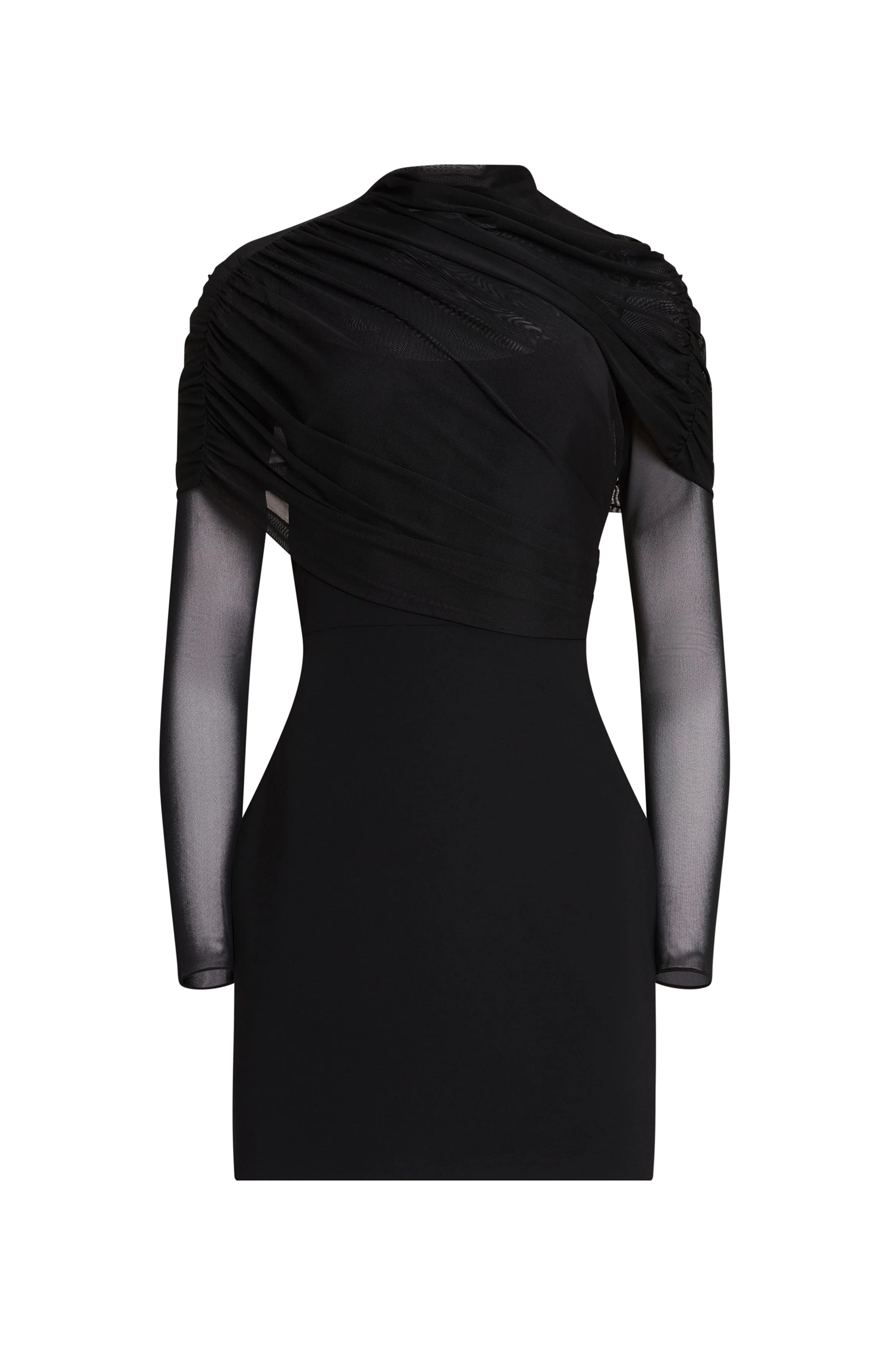 Elevate your look in the Rosalyn Dress. This mini features a sleek silhouette with long mesh sleeves and an elegant draping at the shoulders. Pair with pointed heels and a sparkly purse for a center-of-attention outfit.