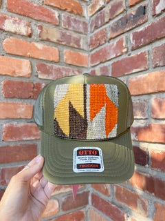 Your easy, throw-on-and-go, trucker hat with Turkish kilim patch. No two are alike! Truckers are one size hat with high crown, structured bill and mesh back with adjustable snaps.