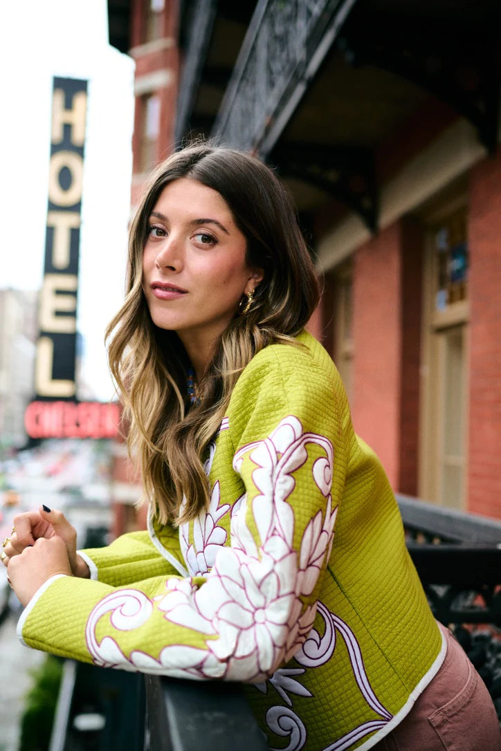 This fitted jacket in an electric chartreuse features sculptural barrel sleeves, framed with white floral appliqué and outlined in maroon embroidery. Wear it with the matching mini skirt for a full look, or style it with jeans and a tank for something more casual. Designed to be worn, loved, and passed down, just like the craft and Portuguese tile work that inspired it.
