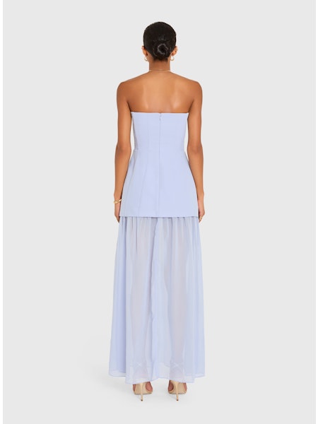 Catch their eye in the Christy Maxi Dress. With a sculpted strapless bodice and a flowing sheer layer beneath, this gown blends structure and softness in one refined silhouette. Add statement earrings and sleek heels and get ready to turn heads.