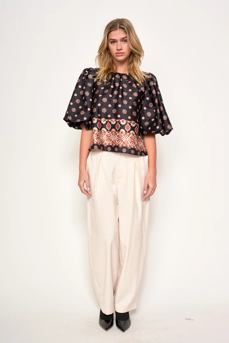 MINORI TOP Both airy and sophisticated, this elegant, Minori top features billowing, 3/4 length lantern sleeves and methodical pleated neckline. Both casual and graceful, this blouse featured in a Charcoal Frost of light peach against a black ground, has that seamless, desk-to-drinks quality ripe with versatility. Pair this piece with the Evie pant for the perfect twinset look.