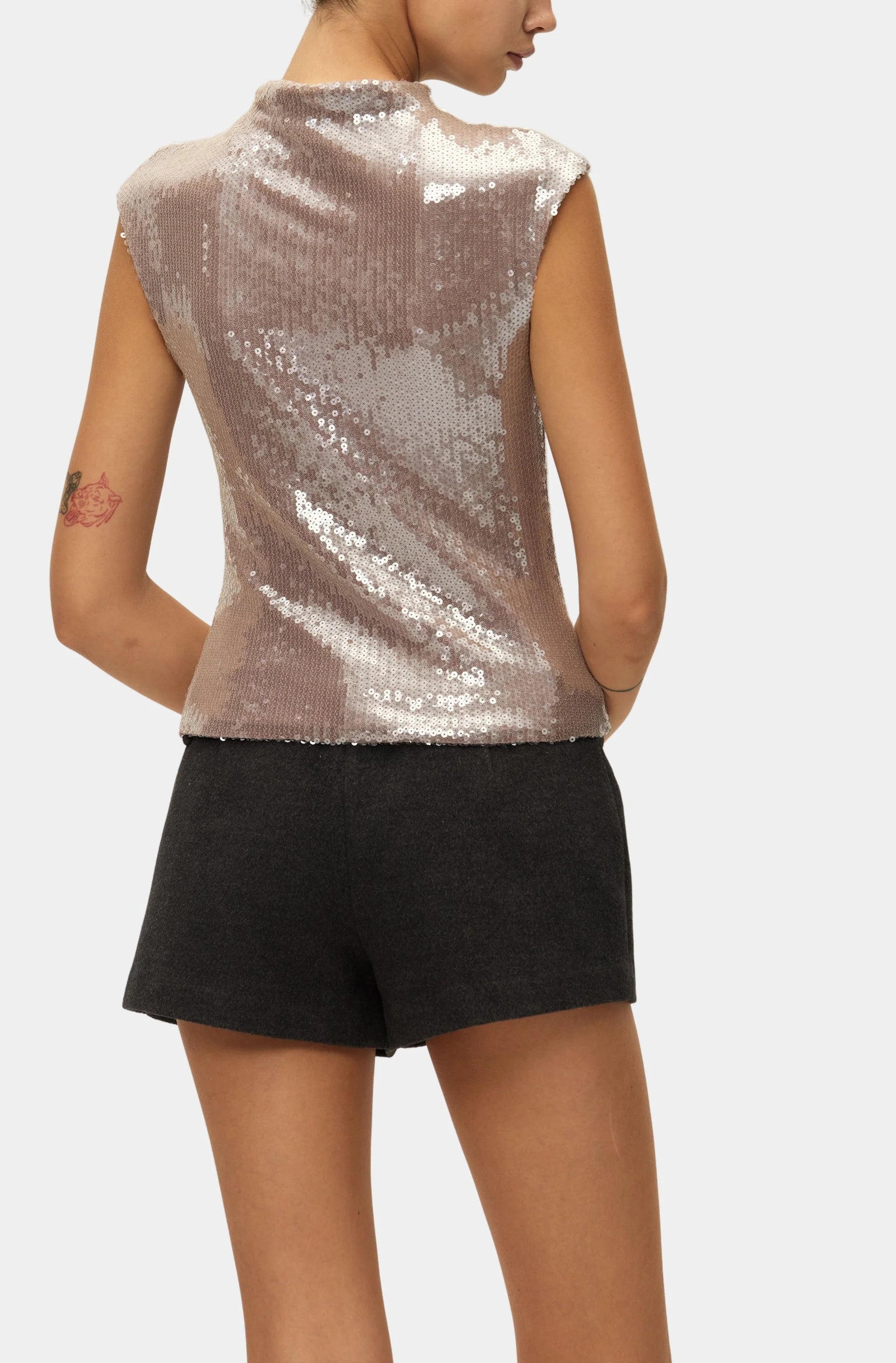 Add a touch of shimmer to your outfits with the Sabrina Sequin Top in mink. This sleeveless top features a mock neck and a smooth, comfortable fit, making it easy to style for both casual and dressy occasions. Pair it with jeans or skirts for a chic look.