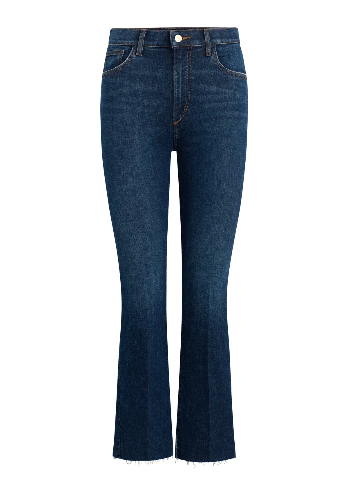 A high rise and slim fit through the waist, hip and thigh with a modest bootcut that hits above the ankle and raw hem.