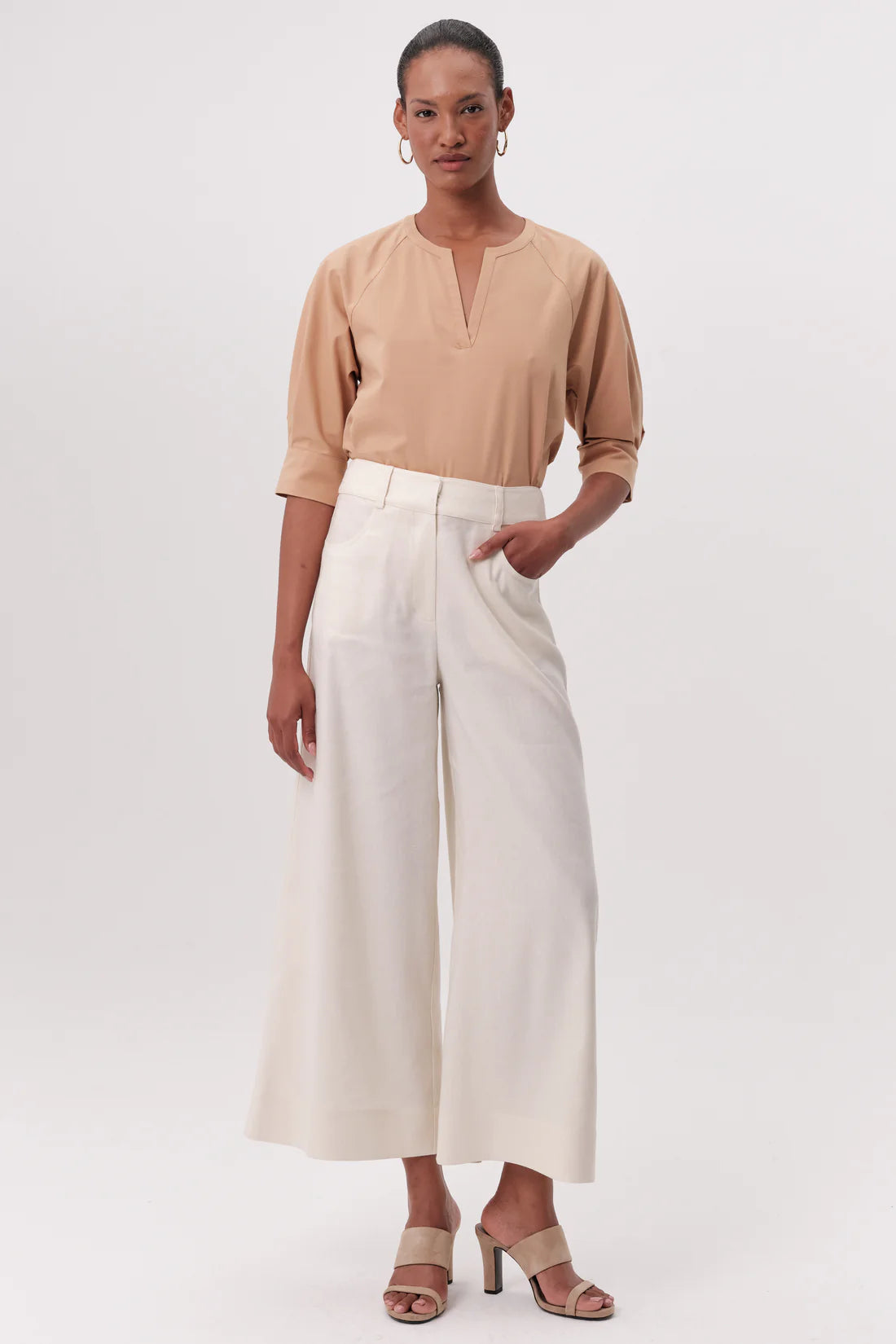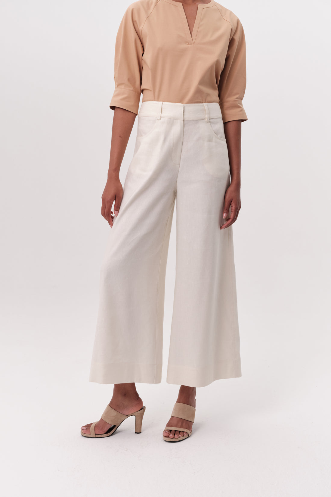 Elevate your wardrobe with the Rebecca Pants in cream by Exquise. These sophisticated trousers feature a flattering wide-leg silhouette with a refined wide cuff that adds contemporary polish. Practical toggle closure and belt loops ensure a secure, customizable fit, while side and back pockets provide everyday functionality. The neutral cream tone pairs beautifully with coordinating blouses for effortless, versatile styling. A timeless piece that transitions seamlessly from office to evening occasions.