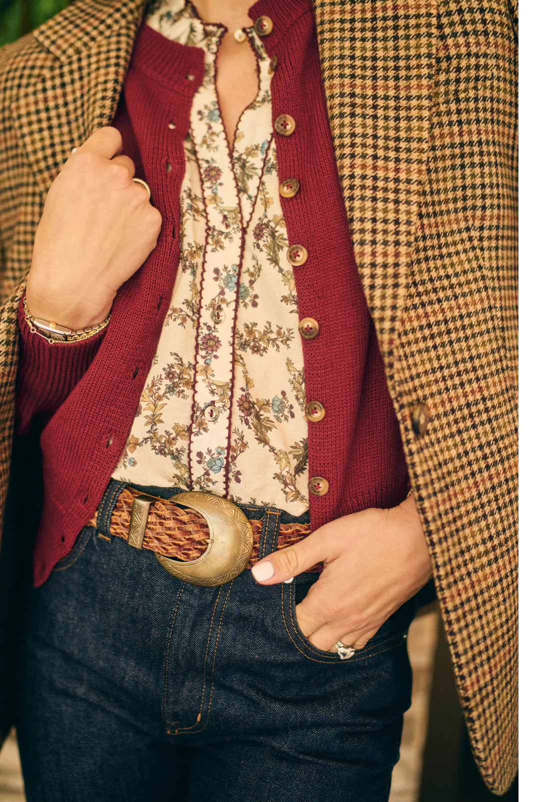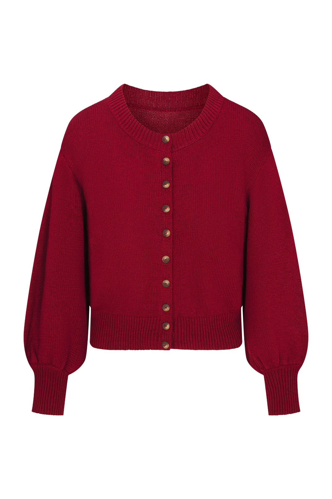 Our Jen Cardigan in Merlot is the ultimate fall wardrobe piece—rich in color, tailored in fit, and endlessly versatile. Designed to be worn layered or solo, its gently fitted waist adds shape when paired over dresses, while the billowy sleeves and soft ribbed knit keep it feeling casual and comfortable. Faux horn buttons and a flattering scoop neckline elevate the look, making it as suited for workdays as it is for weekends.